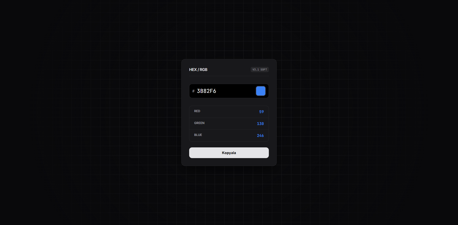 Göz yormayan karanlık tema ve arka planda modern bir kare (grid) dokusuyla hazırlanmış, ultra basit renk dönüştürme scripti. HEX ve RGB değerleri arasında saniyeler içinde, en şık yolla geçiş yapın.