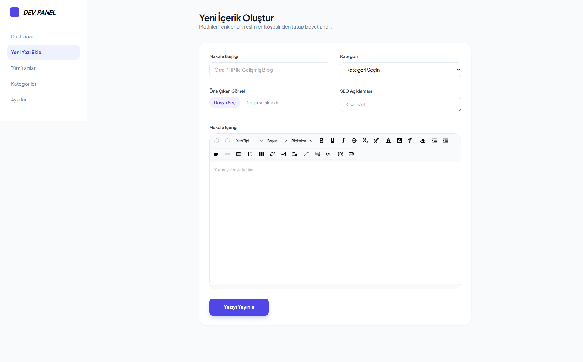Gelişmiş Yazı Editörü: Renk düzenleme, font seçimi, kod ekleme, fotoğraf ekleme, video ekleme vb olan yazı editörü vardır.