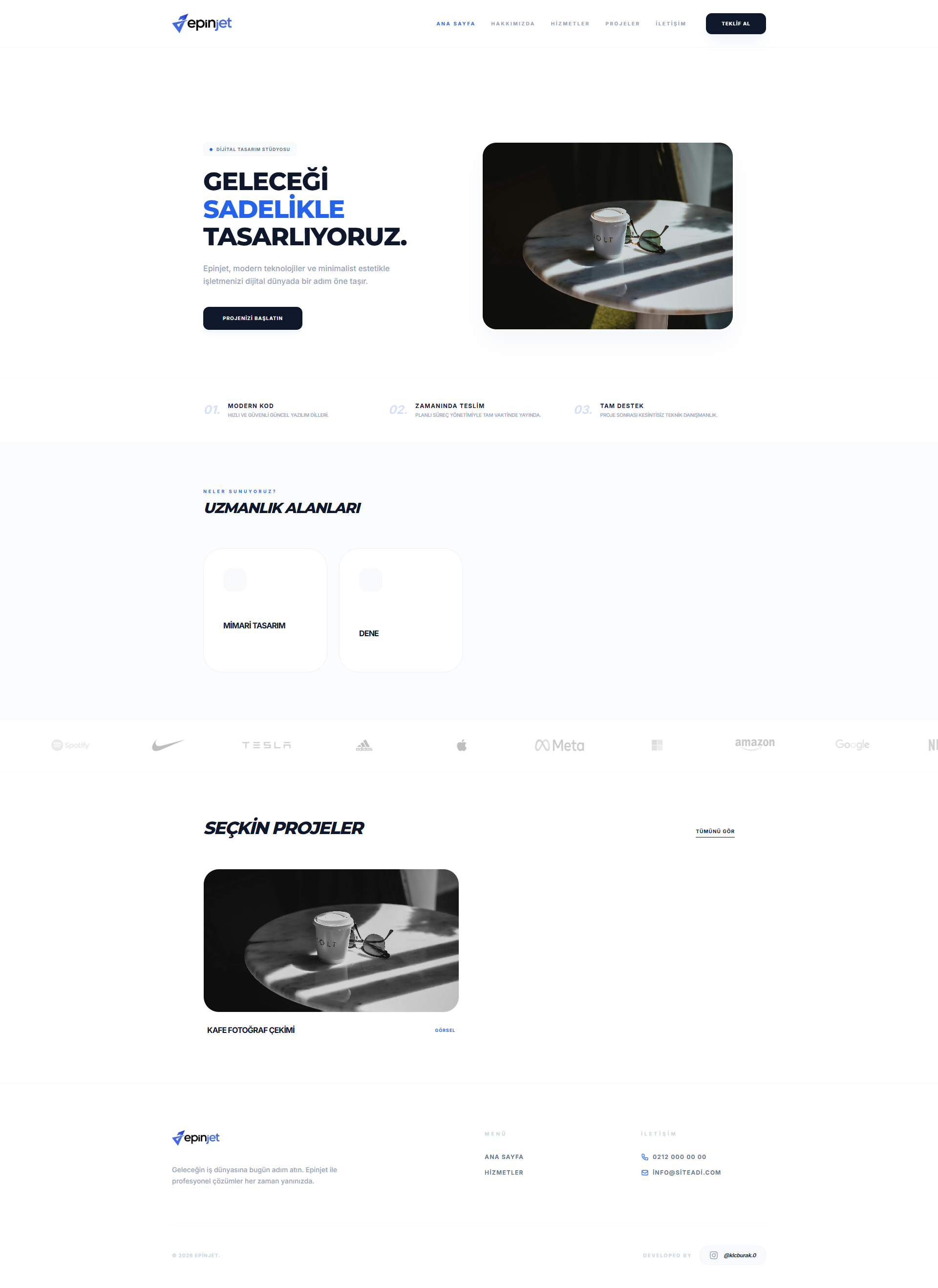 Modern & Minimalist Tasarım: Tailwind CSS ile geliştirilmiş, tamamen responsive (mobil uyumlu) ve ferah arayüz.