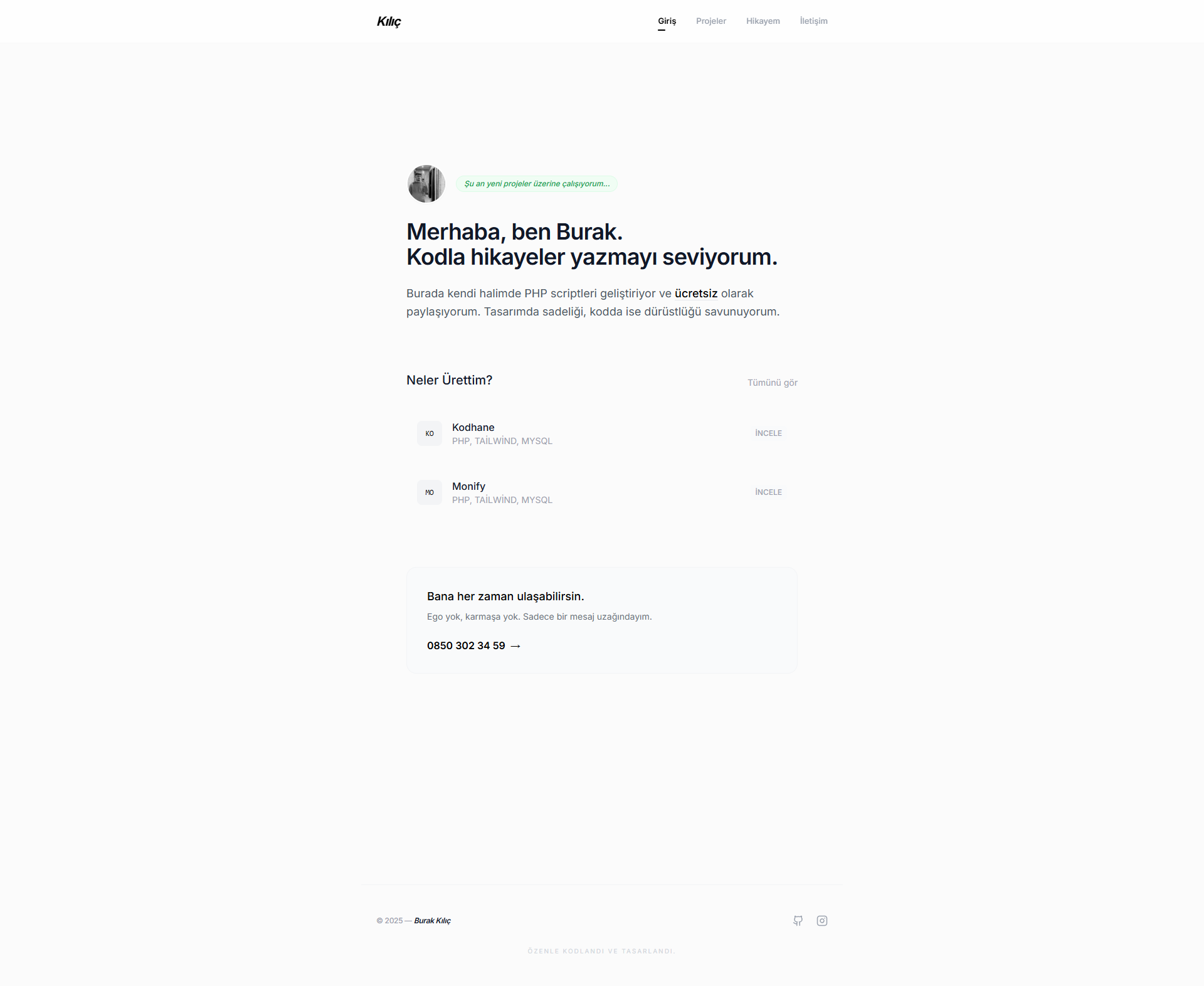 PHP ve Tailwind CSS ile geliştirilmiş, yüksek kontrastlı minimalist tasarımıyla öne çıkan, projelerini saniyeler içinde yönetebileceğin profesyonel bir kişisel portfolyo scripti. Gereksiz kalabalıktan uzak, sadece koduna ve projelerine odaklanmak isteyenl