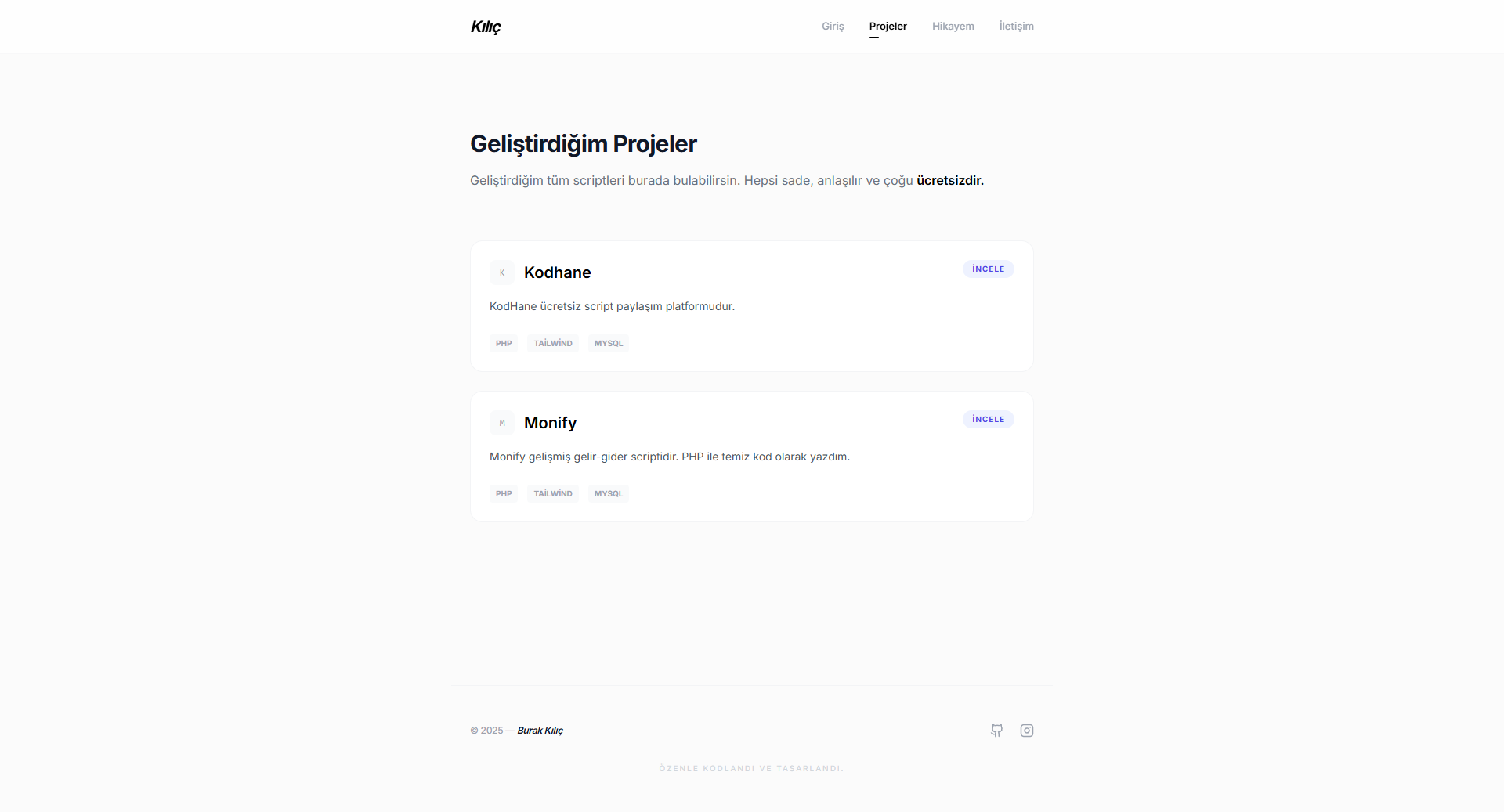 Bu script, modern web geliştiricilerinin ihtiyaç duyduğu hız ve estetiği bir araya getiriyor. Karmaşık panellerle uğraşmak yerine, sadece projelerini ekleyip dünya ile paylaşmanı sağlar. Yüksek kontrastlı beyaz teması (Minimalist White Theme) sayesinde ziyaretçilerini yormaz, projelerini ön plana çıkarır.